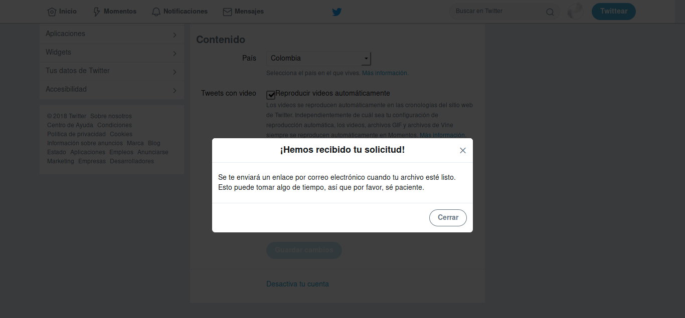 Entramos a nuestro correo, en un tiempo y buscamos un correo de Twitter con un enlace de descarga a nuestros datos.