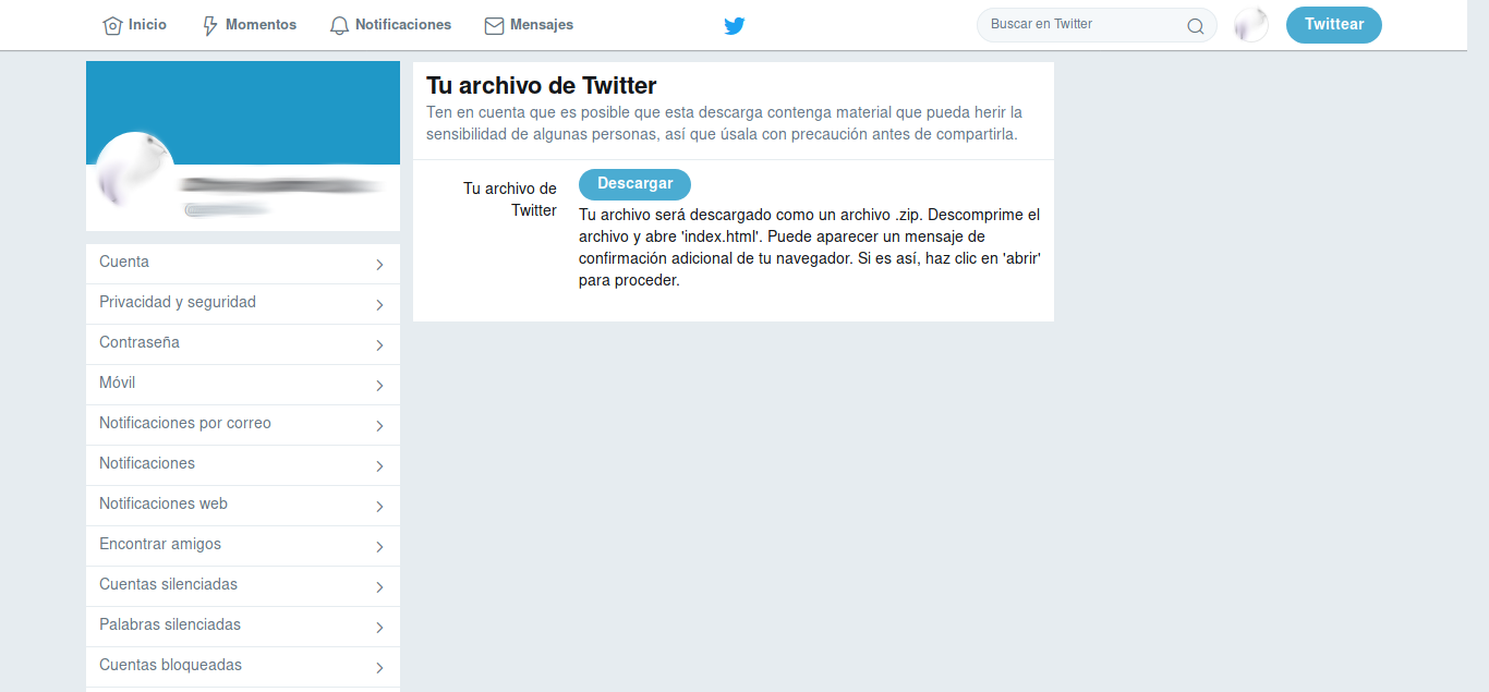 IMPORTANTE: Esta exportación sólo sacará los datos públicos de Twitter (tweets, favs, replies, retweets), pero ningún mensaje directo o conversación no pública será exportada.